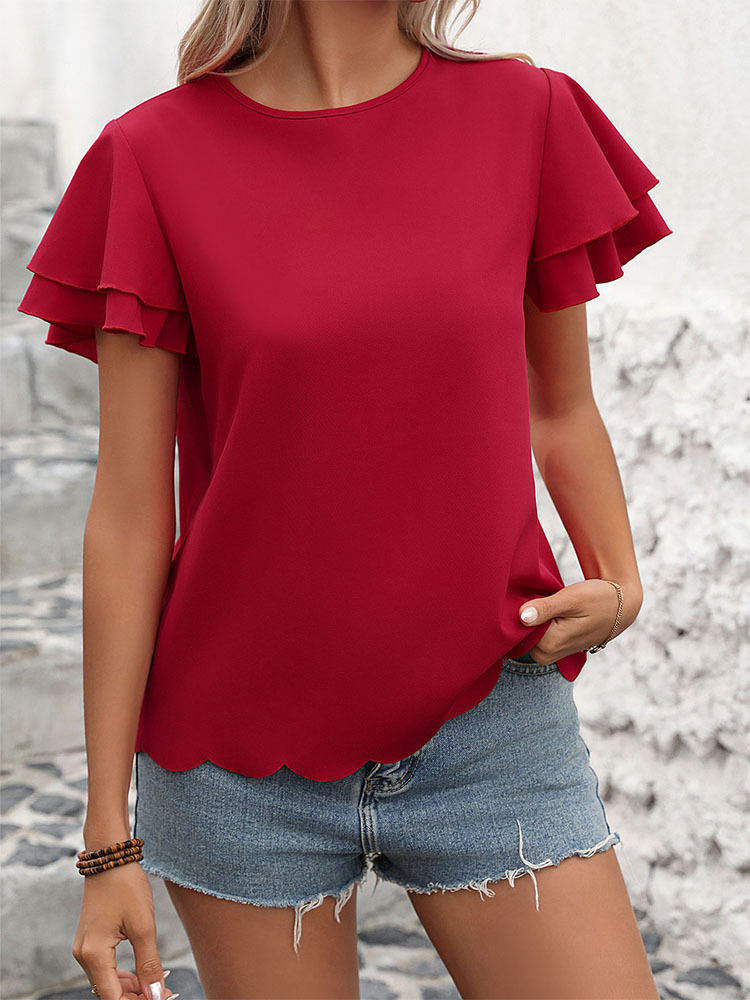 The round neckline and scalloped waist create a flattering silhouette, making this top perfect for casual outings or dressed-up occasions.