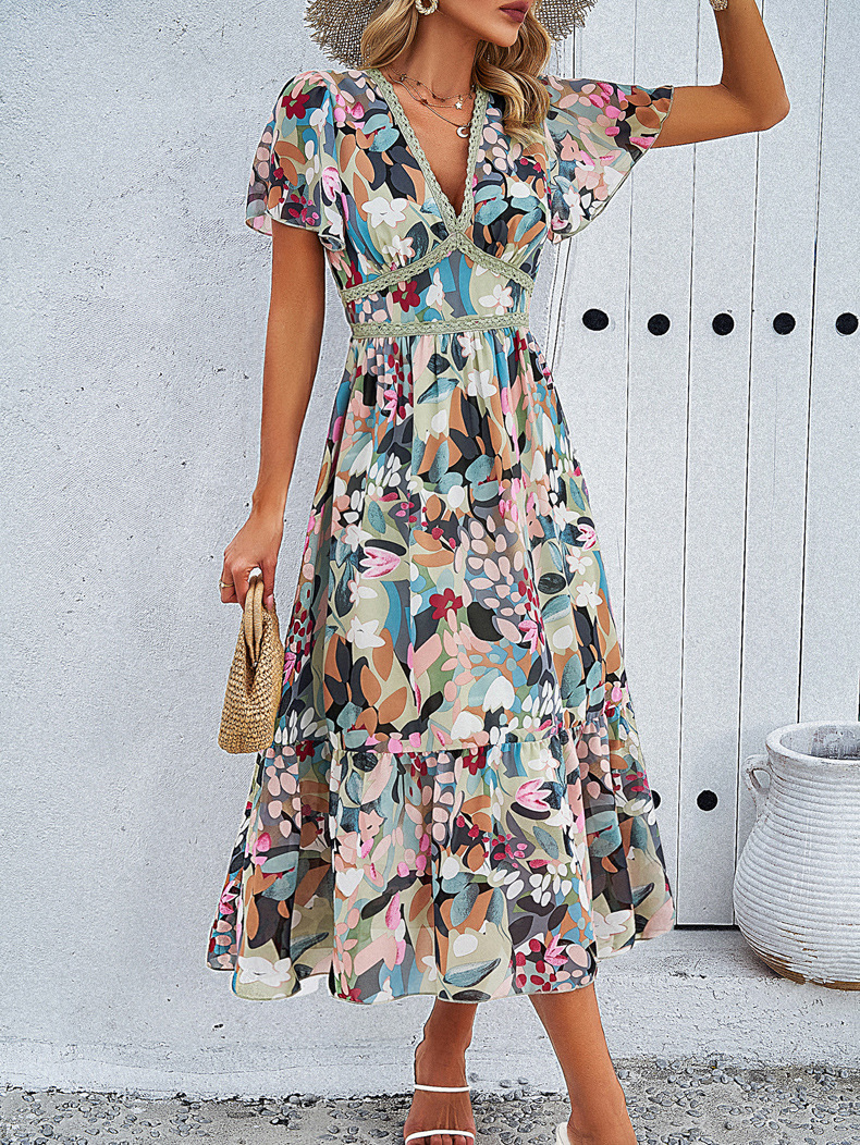 The V-neck and short sleeves give it a breezy, laid-back feel, while the high-waisted design and flowing skirt provide comfort and freedom.