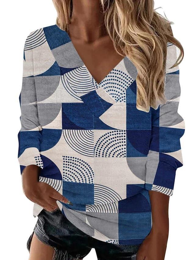 This stylish top features bold geometric patterns in vibrant colors like blue, orange, khaki, and more, ideal for those who love a standout piece in their wardrobe.