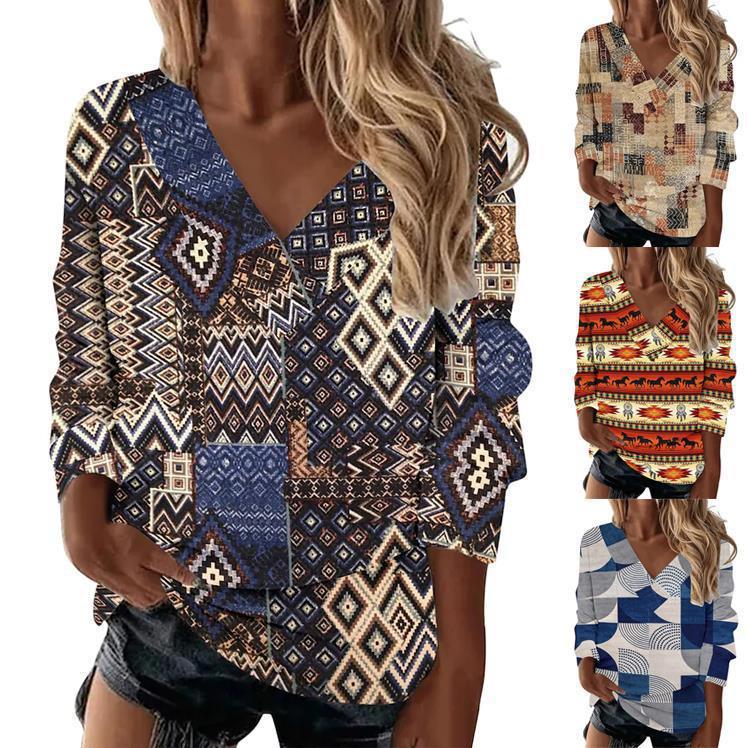 Boho Western V-Neck Long Sleeved Top – Stylish Cowgirl Fashion with Geometric Patterns
