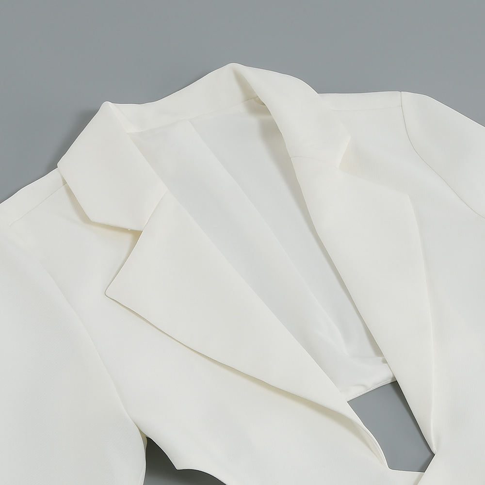 This stunning two-piece ensemble combines a sophisticated long-sleeved V-neck suit jacket with a high-waisted short skirt, offering a sleek and modern silhouette.